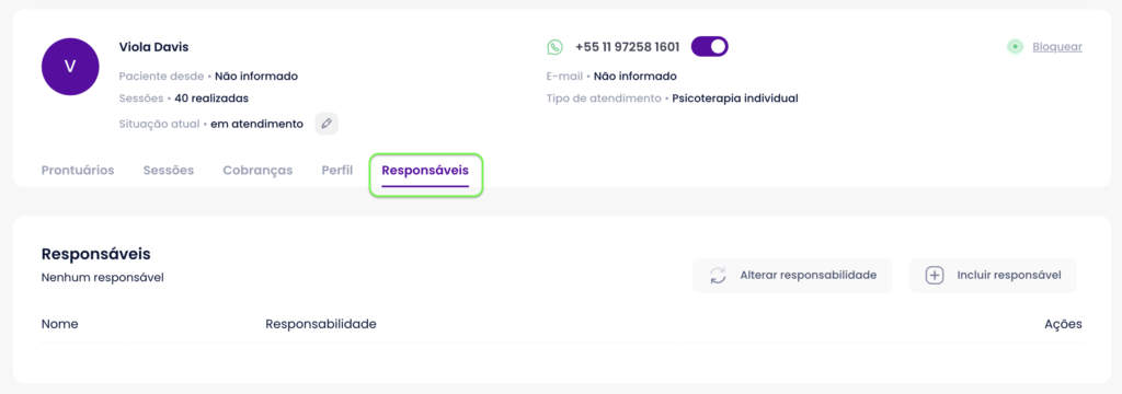 Depois, clique em +Incluir responsável, insere nome, telefone, vínculo e, dentro da responsabilidade da pessoa, coloque Pagamentos.