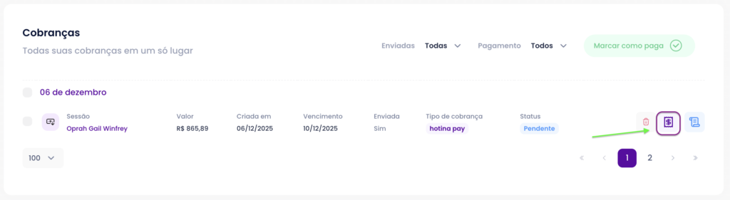 • Tem a opção de registrar que a sessão foi paga sem enviar cobrança?